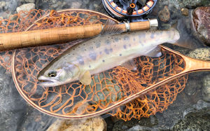 | 車中泊は慣れて快適なんだけれど運転直後と遠足様の興奮で なかなか寝付けない。 朝5;00起床。 寒い、しかもまさかの雨である。 ネットで天気予報を見ると終日雨、アメミルでも周辺は真っ青である。 「はあぁぁ、終わったな、、ははは」。 こうなったら豪雨強制終了までやるしかないのである。 夏休みの合わせ切れポイントに行くと早速ヒット、イワナ。 眠そうなファイト。 8:00、オニギリとパンで朝食を摂る。 雨があがった。(天気予報が頻繁に外れるけれど予測不能な程、天候の異変は深刻) 昨日連絡したNさんと合流。開口一番、「キチガイ〜」、ははは('◇')ゞ。 本命流程を釣る。 Nさん、尺イワナを筆頭に数尾釣る。私はノーフィッシュ。 プールでライズ待ちするNさんと別れ上流に移動する。 荒々しい流れに#12のフライをトレースしてみると下から黄色い背中が浮上し フライをかすめた。超興奮してきた。 フライを#15のコーチマン改に替えて一投、同じ黄色のが咥えてくれた。 相当に強い。私は完全にいったと思ったが、寸足らずであった。 でも、いかつい良い秋ヤマメだ。 |