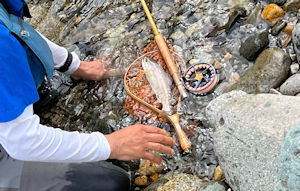 | 底石が集中するあたり、最も気配が濃密な流れに期待を込めて 数投トレースすると、フライをしゃぶる様に出た。 流れに乘って下流に走る。追いかけて2度ランディングをしくじる。 その度「うわっ、しくじった〜」と呟きながらランディング。 午後3:00。 秋ヤマメ。 |