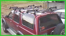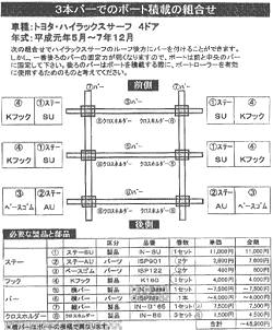 と言うわけで、まずはボートを車に載せるキャリアを用意することにしよう。 ところで、わたしの車ハイラックスサーフは、雨どいがないので普通のキャリアセットじゃボートが積めないらしい。 そこで、某ショップのサーフ用キャリア延長セットの見積もりをしてもらったんだけど、これがまた高いんだよね。 まあ、釣り道具屋だからカー用品が高いのは仕方ないか、特別にセットを組まなきゃならないんじゃ、多少値段が張るのはあきらめるしかないか…。 でも、ちょっと待ってね。 見積書に書かれてるパーツって、あるカー用品メーカーの製品なんだわ。 これってもしかして、自分でキャリアを組めるってことじゃないの? とりあえず、このメーカーのお客様相談室に電話して聞いてみよう。 「サーフにボート積みたいんだけど、どういうキャリアセット用意したらいいの?」 「それでしたら、セット例がありますので、FAXでお送りします。」 「そうですか、じゃお願いしますね。」 で、送ってくれたのがこれです。