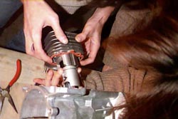 | ピストンを取り付けてシリンダを挿入。傷などが付かないように気を使って作業をしました。中学生の時に技術?で習った覚えのある部分だなーー。 | |