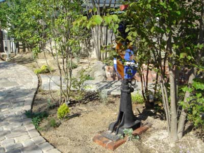 Close-up of the crossing on path, and the stepping stones from brick circle to the well