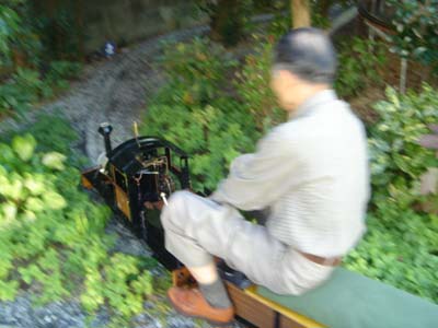 Mr. Hoshino's 45mm gauge clockwork old locomotive, and my live steam Shay on the endless track in the west garden