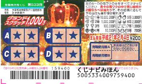 | AからD(1から4)までの青い枠にある2つの星マーク部分を全て削る。各枠の中で同じ絵柄が2つ並べば当たり。出た絵柄に応じて当選金が決まります。 |
