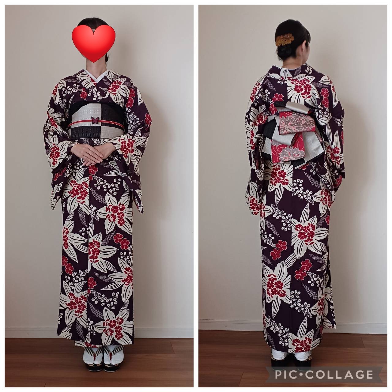 | レトロな柄の着物にモダン柄の帯、全体の小物を紫の濃淡を使い、とてもまとまっていますね なんとなく写真全体に霞がかかっているように見えるのもとても雰囲気が合っています 最近はレトロ柄の反物も人気のようですね、当時の物はサイズが小さく仕立てるのは困難でも、復刻版なら安心! 着物は新しくても小物はお母さんやおばあさんが使っていたおさがりがピッタリかも♪ |