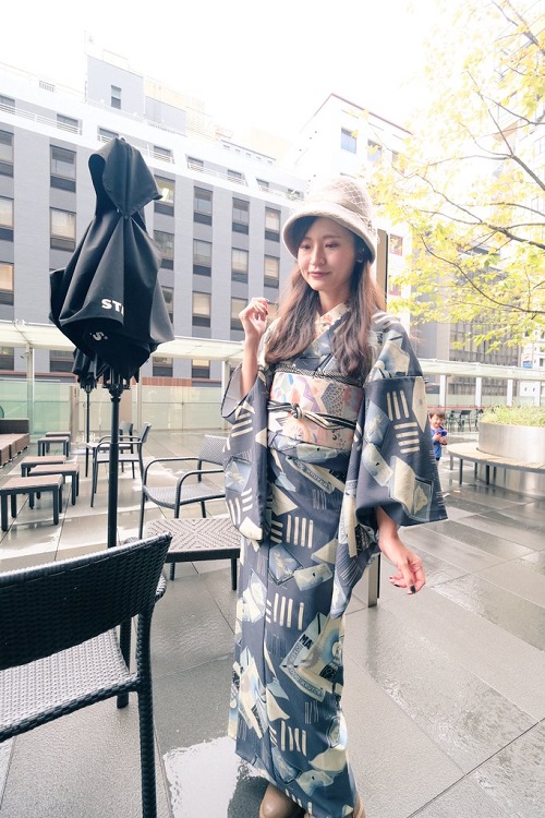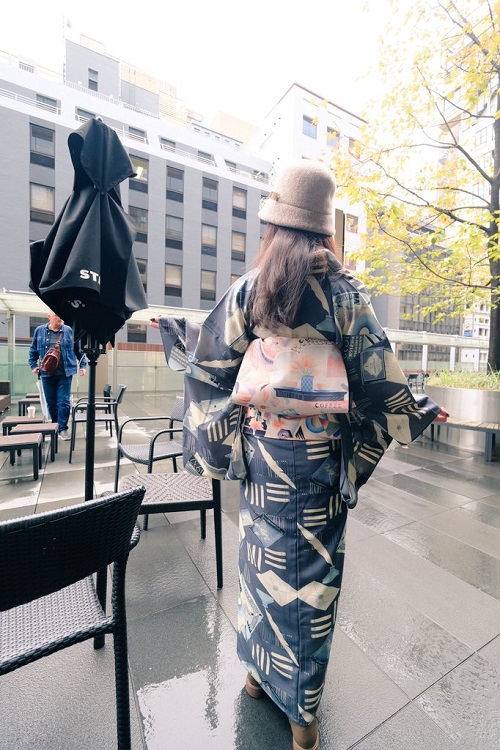 | アフリカンファブリックの浴衣です(白の浴衣は当店で仕立てたものではありません) 他でも少し触れましたが、アフリカの生地は柄が横向きにプリントされているものが多いため、今回はそれを生かし、柄が横に流れるように一方方向に仕立てています 植物の茶系と帯の色味の統一感があり、海外の風景にもとてもよくなじんでいますね |