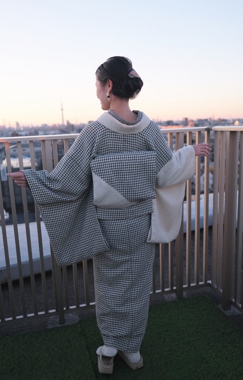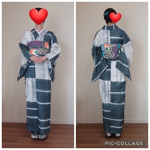 | 色違いの同じ生地を使い、衿・おくみ・右袖を白に変えています 帯は余った生地を使って手づくりされたそうで、ななめのラインが目立つ位置に来るよう工夫されていて素晴らしいですね! モノトーンでシンプルだからこそ、こういったラインが生きてくるなぁと 感じます |