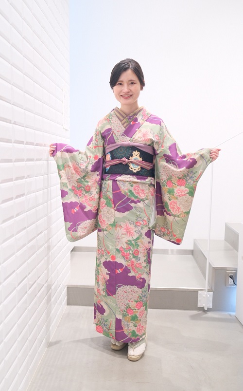 | ペールトーンの花柄に花の刺繍がキレイな薄手の生地です 淡いグリーンの絞りと辻が花の帯が雰囲気を壊さずとても調和がとれていますね 日本はまだ寒さが厳しい2月上旬、ハワイ旅行の折りに、半年早く和装を楽しまれたそうです |
