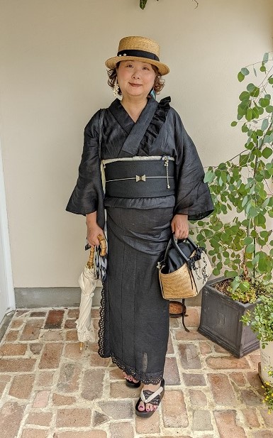 | 白とブルーの爽やかな生地、衿にレースを載せて仕立てました これだけでもぐっと印象が違って見えますね♪ 真夏のお出掛けに、見ているこちらも涼を分けてもらえます |