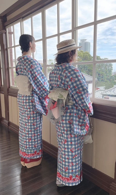 | 伊勢木綿で仕立てた浴衣。左右対称のぶっつけ柄仕立てです 帯の黒と赤のトランプマークのモチーフは白いベルト自体についているそうで、なるほど~アイデアだなぁと感じました 生地の長さが十分あればチェック地の柄合わせも可能です |