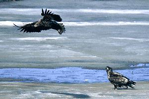 この春、沼の氷が解けかけた頃にこの辺りには珍しいオジロワシの若 鳥が現われました。