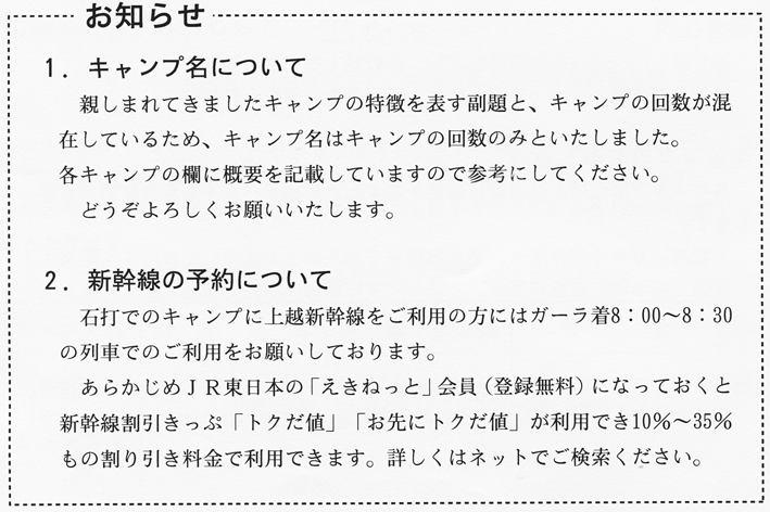 「全キャンプともクラブで国内旅行傷害保険に加入しますが、 補償額は死亡・後遺障害700万〜900万円(条件によって変動) 個人賠償責任3,000万円等となっています。 必要に応じて、個人でも別途保険に加入して 参加されることをお勧めします」