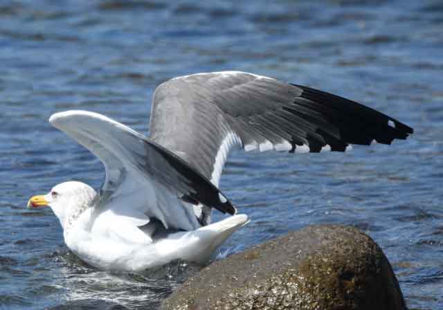 タイリクヒメセグロカモメ Larus fuscus intermedius 背および雨覆の暗色は濃く,足は濃い黄色.3月中旬に初列風切の換羽は完了していて,ミラーはP10のみ,初列風切先端の黒色は P4から始まっています.