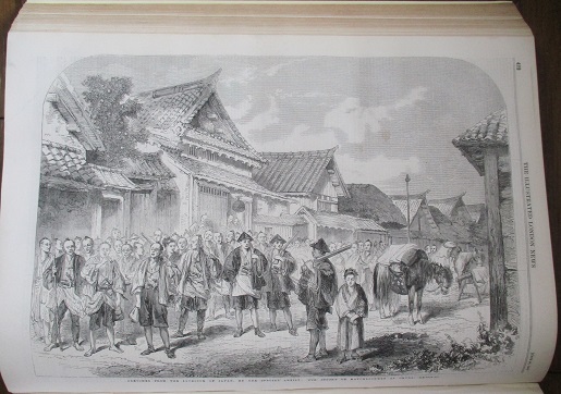 イラストレイテッド・ロンドン・ニュース 第39巻 1861年7月-12月 製本巻 (現代のクロス装 41 x 30cm) 図版索引+全678頁 3点の折り込みカラー図版 ワーグマンの横浜、長崎の風景「横浜の毎日来る講釈師」「日本の官船、馬、税関吏」「横浜の運上所」 東禅寺事件詳報「江戸の英国公使館襲撃事件「オリファント、モリソン両氏への襲撃」 「役人たちの野営」「オールコック氏の部屋の真夜中の情景」 九州騎馬横断旅行「諫早の石橋」「大村で護衛火縄銃兵」「肥前武雄の山道」「武雄(嬉野)温泉」 ¥63,000. (税込み) The Illustrated London News. Vol. 39. (Nos. 1097-1124) July - Dec. 1861. Title page, Index to Engravings to vol. 39, 678 pages, Sketches in Japan : "The Storyteller, a daily scene in Yokohama", "Government Boat", "Japanese Horse", "Custom House Officer", "Custom House in Yokohama", "The Outrage on the British Embassy at Jeddo, Attack on Messrs. Oliphant and Morrison", "Night Bivouc of the Yacunins in the Garden of the Legation", "Midnight Scene in Mr. Alcock's Room at To-sen-ji, Jeddo" "Sketches from the Interior of Japan (Kiushu)", "Our Excort of Matchlockment at Omura", etc. clothbound. |