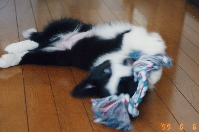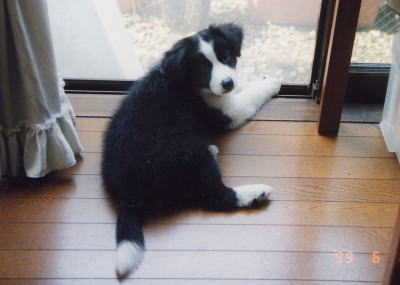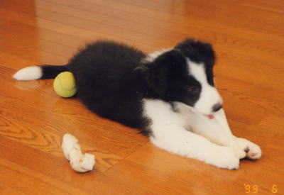 | HALは70日で家にやってきました。家に来た顛末はHAL's Storyにも書いてありますが、とにかくあれよあれよという間に家の子になっていました。とっても慌てていたので、当日写真を撮ったのかどうかも覚えていません。いくら探してもこの写真より前の写真がないので、たぶんこれが一番古いHALの写真なんだと思います。 この日にHALという名前が決まりました。今こうやって写真で見てると可愛いけど、はっきり言ってとんでもない子犬でした。(当時はそう思ってました) あまりに手が掛かったんで写真を撮っている暇もなく、もっと撮っておけば良かったととっても後悔しています。 ボーダーの子犬と暮らしている皆さん、どんなに大変でも写真はしっかり沢山撮っておきましょう。小さい頃は2度と帰ってこないんですから。 |