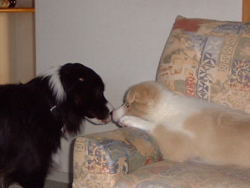 クロス君とセルフィちゃん。セルフィちゃんクリーム色の毛が綺麗だネ。おこちゃまなのに鼻がすっと通っていて別嬪さん。クロス君は「妹ができて僕うれしいよ〜。」って顔してるネ。 |
