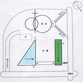 スカウトハウスは、緑色で表されたカトリック会館の2階にあります。