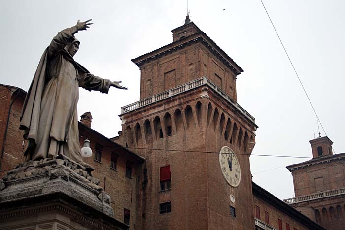 フェッラーラのエステンセ城と、サヴォナローラの像。