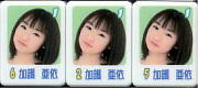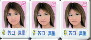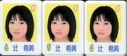 | モーニング娘。ドンジャラ | 現在のモーニング娘。のメンバー10人の牌が各8枚ずつ計80枚から、3人を3枚ずつ集めるゲームです。「タンポポ」とか「プッチモニ」とか「ミニモニ。」とか、自分で役を作っていくとおもしろさ倍増です。難点としては、モーニング娘。を知らない人には全くおもしろくないということでしょうか。ちなみに下の図は「ミニモニ。」という役です。私のルールでは最高得点です。 |