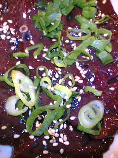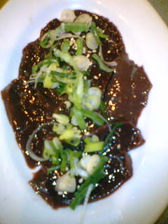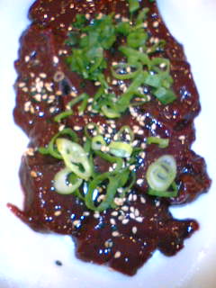 | 狂牛病のおかげですっかり敬遠されている生肉ですが,逆に出してる店は安全なのです。写真右が噂の生肝(いわゆるレバサシ)です左上の自家製キムチも美味! | フラッシュをつけてみましたが,実物はもっと明るい色です。左下のラー油をつけて食べます。そうすると全然臭くなくてびっくり。 | さらに拡大してみました。本当にこの値段でいいのって感じです。レバーに対する認識が変わりますよ。レバーの甘さを堪能あれ。 |