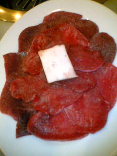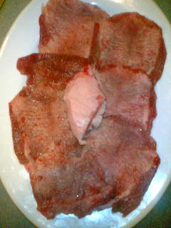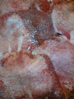 | 最初に焼くのは塩物です。塩タンを食わずして,焼肉を語るなかれ。この美味を知らずして美食は語れません。両面がピンク色の生焼け状態が最もおいしい食べ頃です。最初は塩タンで,生ビールといきたいものです。 | 塩タンには,意外にも脂肪分が多いです。でもそれが美味しい。 | 前菜のラストは生センマイです。生センマイには黒っぽいものが多いですが,今回は白っぽかったです。色は牛の個体差によるみたいで,今回食べた白っぽいほうが美味しいような気がしました。ここらまでが前菜と考えてください。 |
