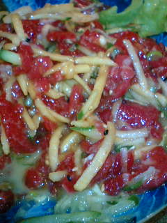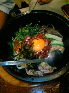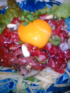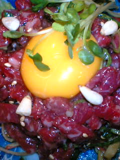 | 色鮮やかな生肉の韓国風刺身,ユッケです。注文してから生肉を粗挽きに叩いてつくるので,30分かかることも珍しくありません。 | だから最初に注文しましょう。そうすれば,中盤に出てきます。本当に新鮮な赤身ですね。生肉に対する偏見が吹き飛ぶうまさです。 | ビビンバに代表されるように韓国料理は混ぜるのもマナーですから,卵黄ごとぐちゃぐちゃに混ぜて,一口ずつ食しましょう。そうするとありえない生肉の甘さが味わえます。 |