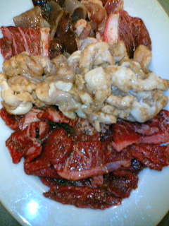 | 手前がほほ肉のツラミ(カシラ),奥が心臓(ハツ)です。このマイナーな部位がなかなかの味で,特に心臓の鮮度の良い日は当たりです。一人前ずつ頼んで様子を見ましょう。 | そしていよいよタレモノを焼きにかかります。そのうち一番安いのは混合です。本当にイカやら鶏やら入ってますが,最初に腹をふくらますには良いですね。量も多いです。ビールにもよく合います。写真は混合1人前+上ホルモン+カルビです。 | なかなか良い焼き加減ですね。食欲をそそります。 |