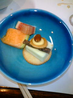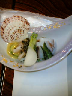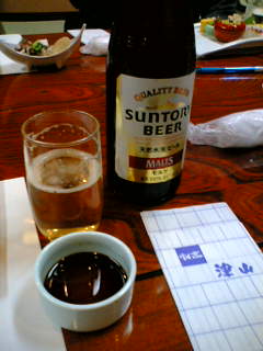 | 最初にかわいい前菜が沢山出るのが,津山のいいところですね。 | 酒がすすみます。 | サントリーモルツです。 |