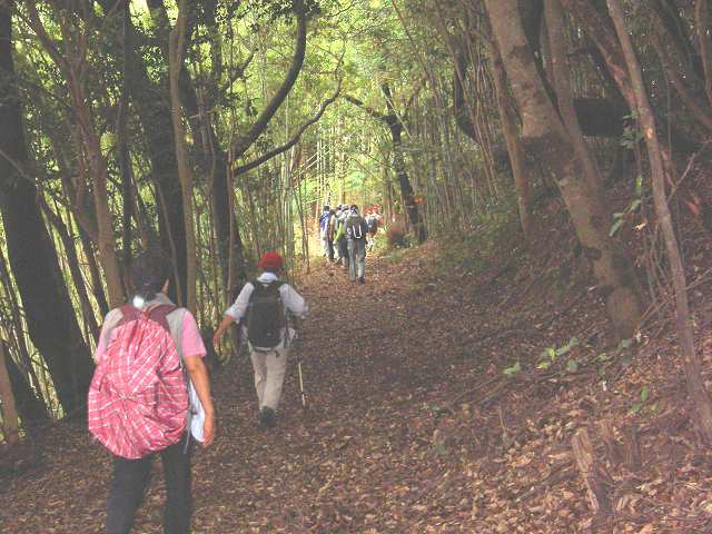 | 大峠からの下りはずっと薄暗い道が続く。落ち葉でふかふかの、いささか急な下り坂をとっとこ降りていく。お腹は一杯、休養は十分で皆元気元気で下りていく。時間を稼がないと御坊駅到着時にはお星様が出ることになるかもね〜。