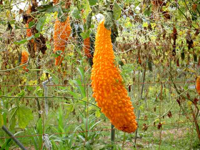 ゴーヤでしょ!紅葉?してる・で・は・ないか! 私としてはこの方が好みかな。“食べよう”っと言ったら直ぐ返答が。“カスカスで食えん!”そうかな〜、試してみないと判らないよ・・。思わぬところで紅葉?を楽しんでいると、次はキウイの鈴なりに出くわす。 これはブッシュなどと絡み合い野生化している、所有者無しと誘惑されかかると背中から無言の圧力が・・?。 |