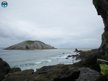 雨はいつのまにか上がり海上の空は少し明るさが増してきました。これは幸い、何としてもあの砂州の上を歩いてみたい、左手の砂浜にも行ってみたい、と少し右手へ行ったところの岩場から下に向けて取り付けられているセメントの階段へと向かいました。ところがこの階段は12段ほど降りたところで突然途切れ、その下は1メートルほどの高さで岩が垂直に崖状になっています。ビーチへ降りるにはここから飛び降りるしかないようです。それ自体は不可能ではないと思えますが下には岩があり、苔が貼り付いて雨に光っています。着地時にすべって足をくじきかねない上、戻る際には手足をかけてここをよじ登らなくてはなりませんが、濡れてすべりやすくなった岩はかなり危険そうです。さらに問題なのはもし無事に降り立てても左手の三日月ビーチへこそ細い砂浜を伝ってたどり着けそうなものの、右手の砂州へは途中の岩壁に波が打ちつけているのでこちらからは絶対に到達不可能です。しかし先ほどから砂州の上を一人の男性が歩いているのが見えますし、目をこらすと小島の岩壁にもぽつんと一人釣りをしているような人影があります。どこかに別のルートがあるに違いない、と階段を引き返し、上の岩場を先に進んでみることにしました。黒く濡れた岩がごろごろと積み重なっている上を両手も使いながらなんとか7〜8メートルほどは行けたのですが、岩どうしの間の隙間がだんだんと広く深くなってきた上、この先に覆いかぶさるようになっている上方の崖から滲み込んだ雨水がまるで破れた雨樋のように音を立てて落ちていて、その下を通過しなくてはなりません。どうしようもなく立ちつくしてしまいました。日本でならたぶん無理をしてでも先へ進んでみるのでしょうが、ここは異国、もし滑って怪我をしても勝手知った病院はありませんし、万一動けないような大事になってもこの天候の中何時間も誰も見つけてくれそうにありません。本の中の写真を思い返してみると砂浜はもっと広くつながっていて島へ渡る砂州もずっと幅があったはずでした。運悪いのは天候だけでなく、ちょうど満潮に近い時間帯に当たってしまったのだと思われます。 |  コバーチョス・ビーチ