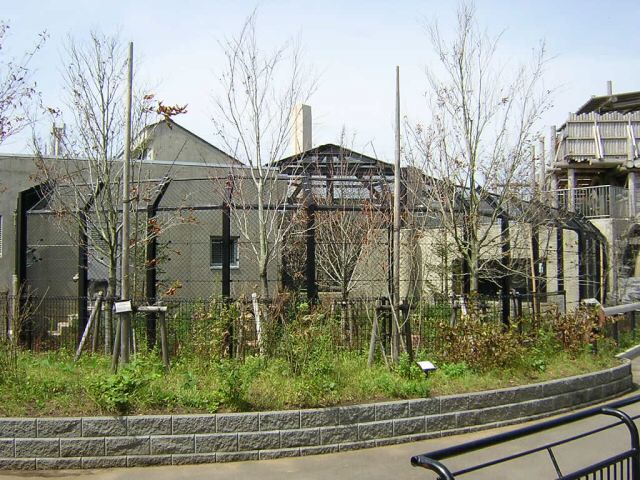 ![]() | 「王者の森」は園内でも高い場所にあり、他にライオン・ベンガルトラ・ユキヒョウ・ツキノワグマがいます。 手前がオオカミ展示場、奥はユキヒョウ、右の高い部分が市内を一望できる展望台。 |