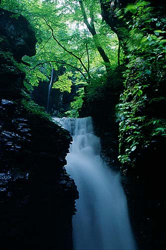 奥に見える一筋の滝はスッカン沢本流のものではなく右岸から落ちている。雄飛の滝の前後の右岸を形成する柱状摂理の崖からは玉簾のように水が滴り落ちている。とても魅力で幻想的な光景ではあるが写真に収めるとなるとまことに難しい被写体である。 この滴りをこよなく愛する私の友人は、敬愛と憎悪の念をこめて「ションベン滝」などと称している。 鹿股川水系スッカン沢 雄飛の滝(栃木県塩原町) Canon EOS 620 Canon EF28-80mm F2.8-4.0L USM F11, 2sec. (+0.5EV補正) Ektachrome E100SW | ||