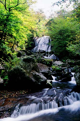 現在は崩落のため通行できなくなっている塩の湯からの道を歩き続け、スッカン沢に懸かる吊り橋を渡るとこの滝の姿が見えて来る。硫黄分が溶け込み白濁するスッカン沢に対し桜沢は澄んだ流れを見せる。