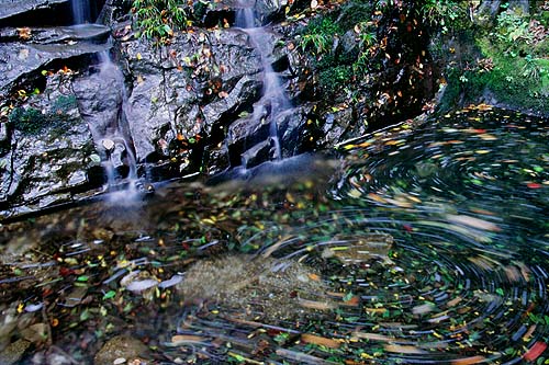 滝壺はほとんど土砂に埋まっている。この日はわずかに残った窪みに往年の姿を垣間見ることができた。