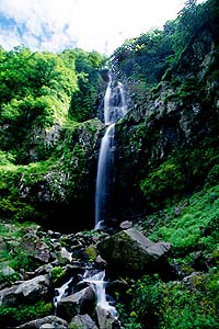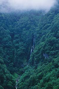 はっと気がついてあわててみんなの後を追いかける。その先にも何本かの魅力ある枝沢が懸かっており、いずれも清流だ。それにしてもやわらかな緑の光と緑の苔に包まれたこの山は本当に美しい。道はやがて少し開けた平らな所へ出る。苔むした岩や倒木が印象的な場所でテーブルやベンチも置いてあった。更に進むと再び登りとなり、石畳を重ねたようなガレ場を横断して行く。降雨の後なのでツルツル滑って危ないことこの上ない(^_^;。やがて道は再び下りとなり数分で野門沢へと出た。500mほど先に布引の滝の上二段だけが見える。おそらくガイドに載っている写真はここから望遠で撮影されたものであろう。