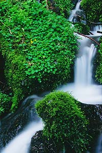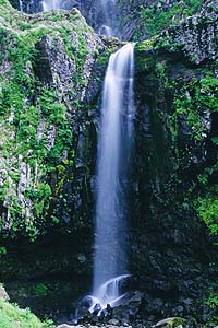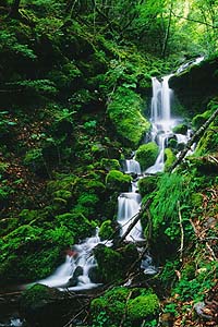 そこからは、恐ろしく急でストロークの大きな階段道であった(^_^;。おそらくこの道は欧米人の大男を基準にして作られたに違いない。帰りのことを思い浮かべ憂鬱な気分でさらに下って行くと突然苔むしたきれいな沢を横切るところに出た。これがガイドに載っていた「冷たい水で喉をうるおすことができる沢」であろう。斜度40度ほどで一気に野門沢の方へ流れ下って行く。まるで全体が一本の滝であると言ってもよいくらいだ。めいめいに、水を飲んだり補給したりして休憩を取る。あんちゃんによれば「こういう状況で飲む山の水が美味いのは当たり前だ」ということになるのだが、本当に今まで飲んだことのないような美味い水だった。しんさんと私はカメラを出して撮影を始める。少し上には落差3mほどのきれいな小滝も懸かっていて箱庭のように美しいところだ。メンバーは小休止の後次々と野門沢目指して降りて行ったが小滝派である私はここに小一時間ほどとどまって心行くまで撮影を続けた。