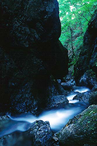 F6(NJWF Fall No.)直下より下流通らずの滝方向を見る。上を見上げるとオーバーハングした両岸の狭い空間から青空がわずかに覗いていた。