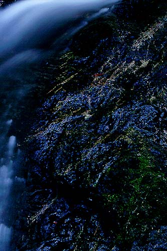 飛沫に濡れ、まるでラピスラズリのような色合いに見える岩。フィルムの発色と光の妙なんだけれど両神山系にはこんな感じの岩が多い。