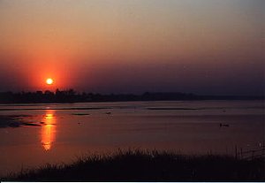 空港から乗合タクシーに乗ってビエンチャンの街へ向かった。 道端に店がいっぱい並んでいて、車や人が多くて、ルアンパバーンよりも賑やかな感じがした。でも、高層ビルなどの近代的な建物がなくて、首都と思えないローカル的な都会の雰囲気だった。 ビエンチャンの中心街に着いて、ゲストハウスを探した。さすがにゲストハウスやホテルがいっぱいあるので、ゲストハウスを簡単にとれた。1泊10000K(620円)。一級ホテルでも1泊5000円位で、ラオスの物価はすごく安い。 ちょうど夕方になったので、すぐメコン川へ行った。 やっぱりメコン川の夕陽はきれい!! メコン川のほとりにある食堂でビア・ラオを飲みながら、夕陽を眺めた。 | ![]() メコンの夕陽 |