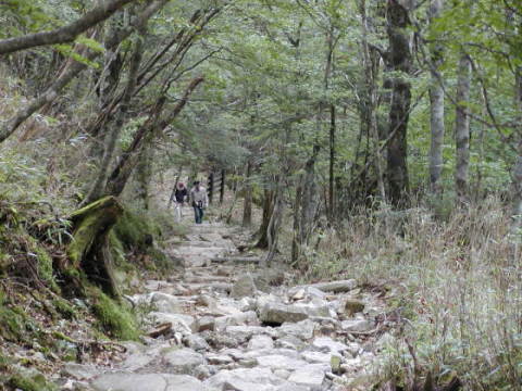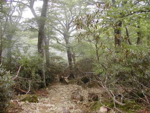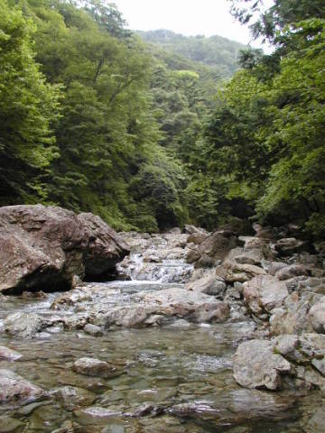 | 大蛇ーから、石楠花の道を、シオカラ谷に降りて行く。 はじめは、下りだから、らくちんと思っていたが、これが けっこう、しんどい。 雨が降ると、山道が川の流れになってしまうのが納得できる。山道は、大小の石がごろごろして、歩きにくい。 小川のせせらぎが聞こえてきた。やったぁ、やっと川だ。 |