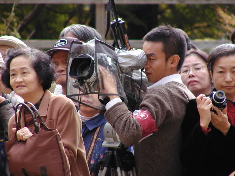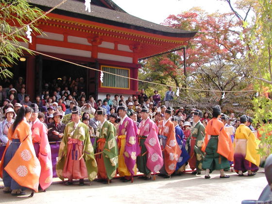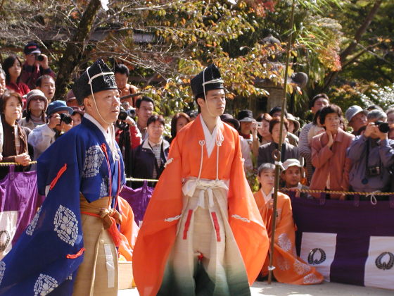 紅葉の名所ということで、一度、行ってみたいと思っていた、秋のある日。 時期的に紅葉にはまだ少し早いようで、人影もまばら。 と思っていたら、次第に人が増えてきた。 今日は「蹴鞠祭り」がある日だと、看板を見て気がついた。 偶然にもこの雅な祭りに遭遇。 NHKの取材も来ており、ローカルニュースで放映されていた。
