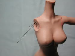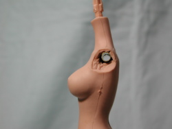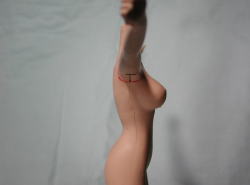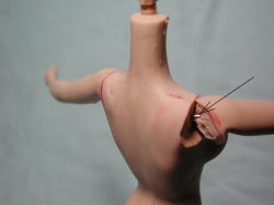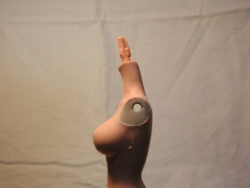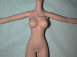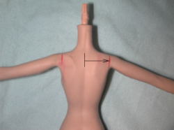 | 腕の切断位置を極めます。 作例の場合、胸の中央から15mmの所にしました。 人によって好みが変ると思いますので、 切断個所はおおよその目安です。 |