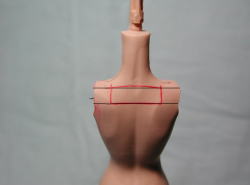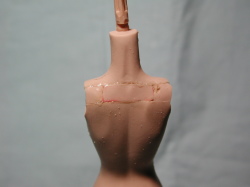 | 脇の下は、上腕の内側から5mmの位置です。 切断する位置が決まったら、切断位置にラインを引きます。 作例では赤いボールペンを使用してますが、 消し難いので鉛筆の方がよいでしょう。 |