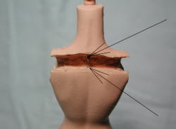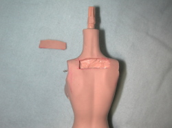 | 両腕をおとしたら、背中の切開作業に入ります。 切開位置は、ワイヤーの通っている場所を中心として 7mmぐらいの幅で行いました。 |