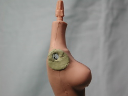 | エポキシパテで埋めました。 ただし、本体がゴムのように柔らかいので エポパテが乾燥後に割れるかもしれません。 なにか他にいい素材を知っている方がおりましたら、御一報下さいネ。 とりあえず、エポパテで作業を続けます。 |
