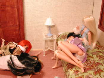 | すずめ:ふぐぐっ!ふぐふんぐぐぐっ!!! (必殺!イモムシアタック〜!!) どげっ!! 初音:うわ!? 彩狐:ひえぇ!? ばん!! どさどさどさっ!!! 雪枝:ナニよ!?突然!! 初子:あれ?皆さん・・・・ すずめ:ぷはっ! オマエ等、ナニしてんだよぉぉ!!! 初子:ナニって・・・・? |