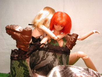 | 彩狐:や〜っ!?ちょっと!ドコにぃ!! 苺:くすっ♪このまま脳天まで切り上げても良いけどね・・・ 彩狐:た、たんま!ちょっと待ってぇぇ!!(><) 苺:服従を誓えば許してやるよ♪ まずは・・・私の尻にキスをしな!! 彩狐:だ、誰がそんなこと! 苺:そう?(ひたり・・・) 彩狐:あ゛〜!?当たってるぅ〜!!(><) 苺:あははっ♪思い出すねぇ・・・修道院ではよくこうやって虐めたっけ♪♪ 彩狐:やめてぇ〜!思い出させないでぇ〜!!(;_;) 苺:だったら・・・ケツを舐めな!! 彩狐:やだやだやだぁぁ〜!(><) |