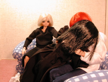 | すずめ:初子、こっち来い。 初子:うにゅ? すずめ・・・(じぃ〜・・・) 初子:・・・(ぽっ) すずめ:初子・・・ちゅっ☆ 初子:ん・・・(ぴくん) 雪枝:そう来たか・・・(^^; すずめ:どうだ? 初子:・・・感じちゃいますぅ♪ すずめ:(ちらっ)・・・へっ! 雪枝:(ぶちっ!) ・・・初子ちゃん、いらっしゃい♪ 初子は、はい。 |