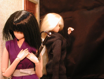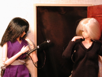 | 美里:「初子」ってコの部屋はドコかな〜っと・・・ がちゃ 美里:げっ!(雪枝とか言うヒト・・・だよね?) 雪枝:あら、初子・・・な〜に?その格好は(^^; 美里:え、え〜と・・・(^^; (この場をナントカしないとぉ〜・・・) 雪枝:何かのコスプレ? 美里:(ほっ)そ、そ〜です!お、女忍者です!! 似合いますか〜・・・みたいな?(汗) 雪枝:んふ♪可愛いわよ(^^ でも何でそんな事始めたの? 美里:え〜・・・い、一緒に忍者ゴッコしませんか? (だぁ〜!ナニ言ってますか?私!!(;_;)) |