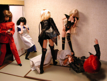 | ・・・ばたばたばたばた!がらっ!! 芥:なんじゃい?騒々しい! 美影:ぜいぜい・・・ただいま戻りました! 芥:首尾はどうじゃ? 美里:つ、連れてきましたぁ〜・・・ 芥:なんと! で、誰を攫って来たのじゃ!?(わくわく♪) 美影:そ、それが・・・(^^; 美里:全員です〜・・・(;_;) 芥:偉い!偉いぞぉ!!\(^^)/ 早く!早くココに連れて参れ♪ 美影:あ・・・今、来ました・・・ |